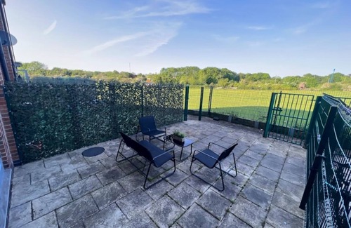 The space features 4 bedrooms , 3 bathrooms, a fully equipped kitchen, a comfortable living area with a TV and cozy seating, and access to a beautiful garden with field views