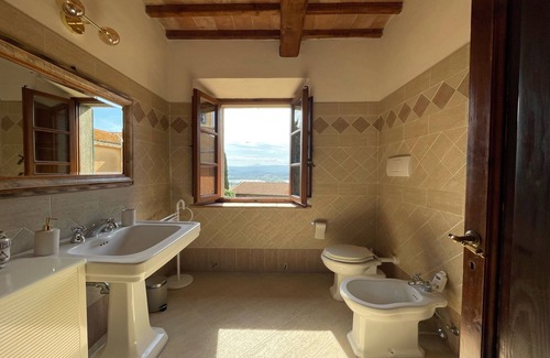 The spacious tiled bathroom has a view down to Lake Chiusi and is equipped with a shower, bidet, basin and WC.