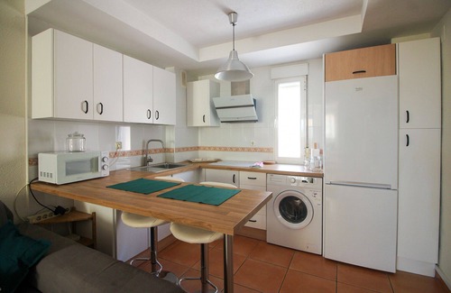 - American kitchen with breakfast bar. Equipped with microwave, refrigerator of one meter eighty centimeters, crockery and cutlery for guests and kitchen utensils. Ceramic hob with three burners.