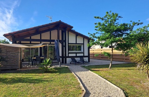 Relaxation and rest guaranteed in this beautiful holiday home between ocean and forest. The location is ideal for discovering the Landes beaches just 8 km away, the Azur and Soustons lakes with all the water sports, bike rides thanks to the nearby cycle path. Not to mention the Courant d'Huchet and the famous surf spots on the Landes coast. Here you will appreciate, in addition, the calm and serenity offered by this quiet residential area, on the edge of the forest. This bright and spacious house offers you great benefits: reversible air conditioning, high quality materials, sober and trendy decoration with in addition the half-timbering which gives it an additional charm... A new comfortable address for a weekend or a week on the coast with family or friends. This detached cottage is set in private grounds of 250m² opening onto the forest, with covered terrace, garden furniture and plancha. On one level and air-conditioned, it consists of a large living room with lounge area (TV, WIFI, 2-seater sofa bed), dining area and fully equipped open kitchen (induction hob, extractor hood, dishwasher, refrigerator with freezer compartment, electric oven, microwave), 2 bedrooms (1 double bed and 2 single beds which can be made into a double bed), a bathroom (large Italian shower), a separate toilet, a laundry room (washing machine). Baby equipment (cot, changing pad and stroller) can be provided on request. For your comfort heating and electricity are included.