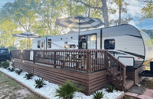 Let's Go Glamping! nSite 8047 - Ocean Lakes 2BR/1BA Camper with large deck | RV Rental in Myrtle Beach