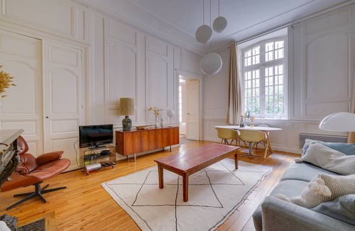 In the heart of the old city of Bordeaux, this apartment fully restored in 2011 will seduce you by its size, its character and its contemporary choice. It has kept the charm of the old Bordeaux apartments with high ceilings, wooden floors, woodwork, fireplace ... It is ideally located in the historic center, and you will be able to discover the city on foot. It is in a small stone building overlooking a charming cobbled courtyard with trees, so it is very quiet.