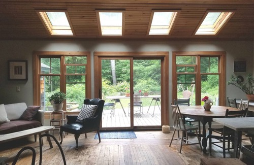 Magical, this property sits on three acres w/ groomed flower gardens and abuts state forest. It is private yet only 3 min to the hamlet of Phoenicia. Miles of hiking are right behind the house. The house has three bedrooms with queen size beds. There is a single bed by the wood stove. The great room (living , dinning, kitchen) is filled with sunlight and opens to a large deck with bird feeders that get plenty of guests. Great walking on path along the river. Near skiing areas!