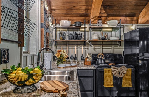 Unwind in the inviting living room after an exciting day exploring the Smokies or enjoying quality time with your loved ones. The open-concept living space is designed for comfort and relaxation, providing the perfect setting to wind down. Cozy up every evening to the warm ambiance of a fire in the wood-burning fireplace on chilly Smoky Mountain evenings. Gather around the comfortable futon sofa, sip mugs of hot chocolate, and engage in lively conversations, making cherished memories in this warm, cozy atmosphere. It's the perfect spot to settle in and enjoy your favorite movie together on the flat-screen TV.