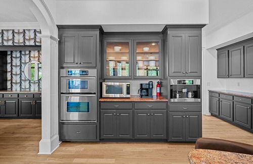 The chef's kitchen is fully equipped for gourmet meals or casual snacks, featuring high-end appliances, ample prep space, and open flow to the inviting family room. Gather around the plush sectional for movie marathons or unwind beside a second gas fireplace. Mornings start perfectly in the sunny breakfast nook or at the dedicated coffee bar, offering both drip and K-cup brewers for your caffeine fix.