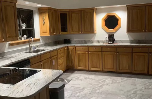 The first floor has one bedroom with double size bed and tv , full bathroom with shower only. There is a second kitchen downstairs with sink , fridge/ freezer and air fryer only . There is a Tv area with couch off the kitchen ,which opens up to the game room. There is pool table and air hockey. Ping pong is on screened in porch on second floor .
