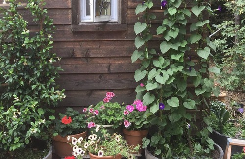 In an orchard near the quaint town of Graton, this is a 240 sq. ft. Tiny Tumbleweed house connected to a newly constructed living/dining room. Enter through a screened in porch to the light filled living room with a double futon. Then go through a hallway to the Tiny Tumbleweed. The TTW has a sleeping loft accessible by a pull-down ladder, as well as a kitchen and a full, plumbed bathroom with bathtub! Outdoors is a field with mature fruit trees, a variety of berry bushes, raised beds, and redwoods.