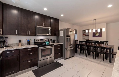 FIRST FLOOR: Entryway leads to a Living Room with new furnishings and flat-screen TV with cable premium channels. It has plenty of seating and lighting. Master bedroom with King bed, flat screen TV (with cable premium channels) with its own private full bathroom. Brand new kitchen with all new steel appliances. Dining Room with table set up for six with one leaf to increase seating for up to eight people. Half Bath in hallway. Washer and Dryer.