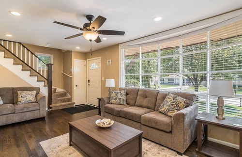 2300 SF renovated unit is 21 min away from downtown Naperville, which is like a bustling mini Chicago, including a beach and plenty of bars/restaurants! This property has 4 bedrooms, & 2.5 bathrooms. Master bedroom has A KING BED, 2 Bedrooms have a Queen, & 1 Full size bed in 4th bedroom. 1 air mattress on-site (Total of 5 beds). Plenty of Kitchen utensils, all you need in a kitchen, including cooking spices and oils! Children friendly & lots of technology!