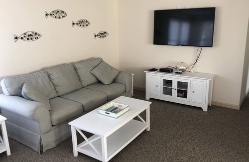 3 bedrooms, 1.5 baths, front and rear decks, grills, parking, 50 feet from Ocean, quiet part of Island, close to entertainment and eating, multiple TVs, and DVDs, New kitchens, New baths, New carpet, new furniture.