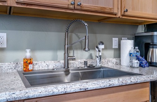 Kitchen is fully furnished with dishes, glasses, silverware, pots, pans, baking sheets, utensils and most items you need to prepare meals at home. Full-size refrigerator/freezer, electric oven/range, dishwasher, microwave and coffee maker. Dining room table seats six.