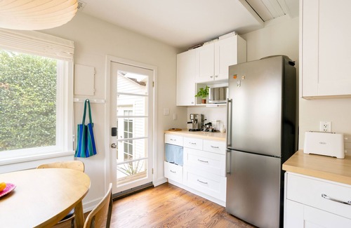 The simple and modern kitchen has everything the chef could want, including a deliciousespresso maker. Sitting around the dining table for four adults, you are greeted with views of the yard and the surrounding hillsides of the Mount Washington neighborhoods.