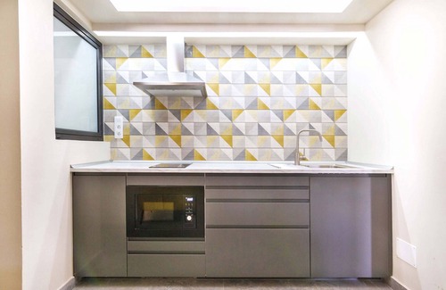The kitchen is equipped with refrigerator, microwave, freezer, washing machine, dishwasher, dishes/cutlery, kitchen utensils, coffee machine and toaster
