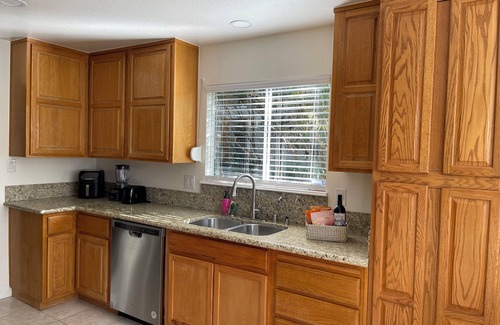Fully equipped kitchen, with all the appliances, pots and pans, dishes, glasses. Appliances include dishwasher, refrigerator, stove, oven, microwave. Coffee maker and blender are also available.