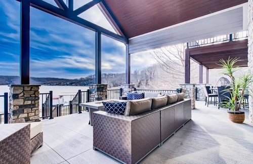 This 6 bedroom, 5 bathroom house sits on the banks of a quiet point with breathtaking views of the lake. Making this the ideal location for either a family gathering, relaxation, or wedding event.This house is overlooks a quiet cove with views of the lake and other lake homes. You will feel incredible secluded as you are sitting on the back patio.