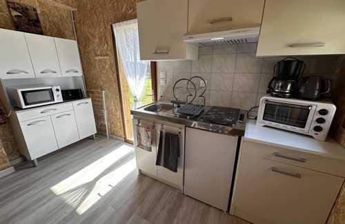 Lou Coutiot is an ideal cottage for a stay for two, or with family, between ocean and forest. Just 12km from the beaches, you stay in the heart of the Landes forest, in a real traditional airial. This privileged setting offers you a direct view of the pines. The vast plot of 3925m² is entirely enclosed and allows you to enjoy a large natural space offering calm and serenity. The swimming pool shared with the owners on site (dimensions 9.50m x 4.50m, depth 1.40m) is open from June to September depending on the weather. It allows you to relax and unwind in an enchanting environment. Here, you will also appreciate the wooden cladding of the cottage which reminds you that we are in the Landes, the functional layout and the mezzanine which makes a cozy little cocoon. A nice address to discover all year round, during holidays or a business trip. This independent air-conditioned rental is arranged on two levels. It is composed of: - a ground floor with a living room with relaxation area (sofa bed for 2 additional people with supplement, TV, WIFI), dining area and kitchen area (2 electric hotplates, mini grill oven, microwave, extractor hood, refrigerator with freezer) a bathroom with shower a separate toilet a pantry area with washing machine - upstairs a mezzanine bedroom with a 140 bed For your comfort, sheets, towels, household linen, water and electricity are included, as well as end-of-stay cleaning. Baby equipment can be provided at your request. This cottage is non-smoking. Given its location in the middle of the forest, it is forbidden to use a barbecue (municipal ban).