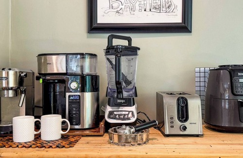 Kick off your shoes and settle into vacation mode. The living room is the perfect chill zone with a cozy faux fireplace, squishy couch, and a TV for movie nights or lazy mornings. Just a few steps away, there’s a sunny dining nook for six and a bright, cheerful kitchen that’s ready for everything from pancake flips to wine-and-cheese nights. Both bathrooms are decked out with spa-like walk-in showers (no tiny tubs here!).