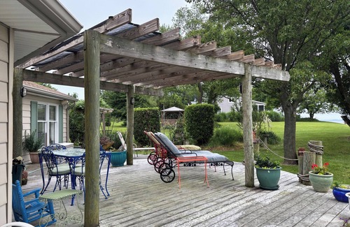Maryland’s Chesapeake Bay is an ever changing panorama of spectacular sunsets, teeming wildlife, graceful sailboats, and impressive ships. We invite you to enjoy it from a truly wonderful, tranquil, historic location, Love Point! Located just 4.5 miles north of the Bay Bridge, we are 10 minutes to shopping, 20 minutes to historic Annapolis, 40 minutes to Baltimore and 50 minutes to Washington, DC. This charming 2800 sq.ft. landscaped ranch home is situated on 1+ acres with 200' of shoreline. There is a dock with ladder providing easy access to the bay for boating, fishing and swimming (sandy bottom). Afterwards enjoy the hot/cold OUTDOOR SHOWER!! The interior spaces are comfortably furnished - a cathedral ceiling spans the kitchen/family room space with large windows. A separate living room looks out to the street and additional multipurpose room with bathroom and sliding doors to back deck offers several public sitting areas. Tables, chairs and loungers outside on the trex deck allow one to relax with a sea breeze while taking in the glorious view. A fire pit, shade trees, hammock, dock, and deck compliment the private and expansive back and side yard.
