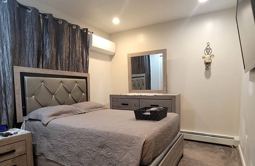 Bring the whole family to this beautiful, spacious apartment. Small rm has a futon that folds out into a full size bed & tv, medium rm has a full size bed & tv, large rm has a queen size bed, living/game room has a couch that folds out into a full size bed, tv, Foosball table & full bathroom. Holds up to 8 guests, no parties, no pets, smoking only allowed on back patio; backyard oasis for relaxation. 10 min walk to USB Arena & Belmont Racetrack, 15/30 mins to JFK/ LGA Airport; many food options.