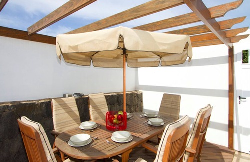 French doors from the living room lead you down 4 steps to the pool area. There is plenty of room around the pool for all guests to soak up the warm Lanzarote sunshine, but if it does get too hot there is a lovely seating area in the shade furnished with stylish, brown furniture. The rectangular shaped pool is heated and is entered by roman steps. The outdoor area also has a gas BBQ and an exterior dining table and chairs.
