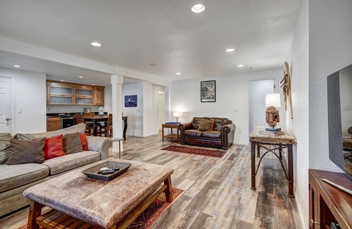 As you head up the stairs to the main level, you’ll find the expansive living area with a cozy gas fireplace, plush couches, and a TV, ideal for unwinding after a day of mountain adventures. The living area seamlessly flows into the dining space and fully stocked kitchen, perfect for preparing home-cooked meals. The second and third bedrooms are also located on this level, each with a queen bed. A full bathroom and half bath are also available on this level, providing ample space for your group.