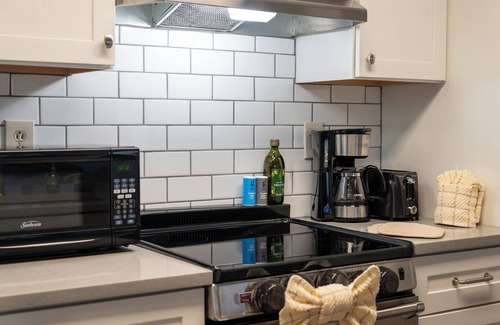 The primary living area offers a welcoming space for guests and pets to relax by the wood-burning fireplace or enjoy the flat screen television. Next to this living space is a beautiful updated full kitchen, which boasts modern cabinetry, new appliances, and a generous quartz island, all designed to seamlessly integrate with the main living space. This garden-level condominium features a modern interior and an open floor plan. For dining, the breakfast bar can seat four, provides scenic views of the mountains and meadows along with access to a private patio. Please note that air conditioning is not available.