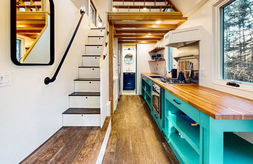 Boasting all of the necessities for a comfortable stay, the tiny house features a sizable dining and seating area, as well as, a well-equipped kitchen complete with ample meal prep space. The bathroom offers a full-sized shower with a rain shower head and gold finishes on the vanity.