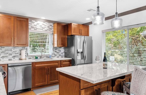 Inside, the roomy residence offers 5 bedrooms, 3 bathrooms, and a contemporary kitchen featuring stainless steel appliances and granite countertops. Unwind on the covered back balcony with views of the pool, yard, and canal. Conveniently situated near shopping, dining, bike trails, and beaches, this rental also includes smart TVs (no cable) for your streaming enjoyment. Reserve now for an unforgettable tropical getaway!*Please note: The boat lift is not available for guest use.