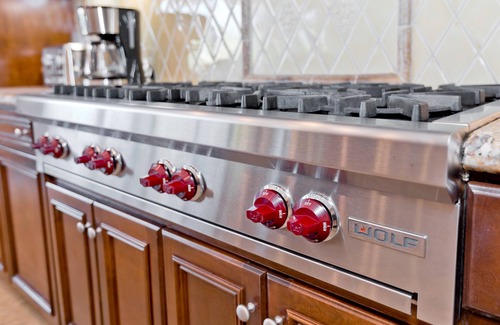 The thoughtfully designed and equipped Chef's kitchen features granite countertops, Sub Zero refrigerator, Wolf 8-burner range, and Wolf double ovens. The pantry and kitchen are thoroughly stocked for a bake-off.