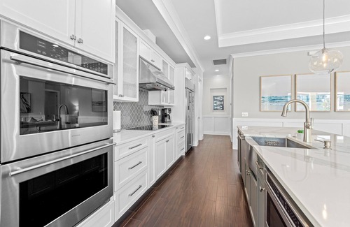 The interior showcases an abundance of natural light, contemporary furnishings, and a spacious open-concept layout. Highlights include a gourmet kitchen equipped with high-end appliances and double ovens, an oversized kitchen island for casual dining, a window-lined formal dining area, and a sophisticated living room outfitted with smart TVs — perfect for family movie nights or quiet evenings in.