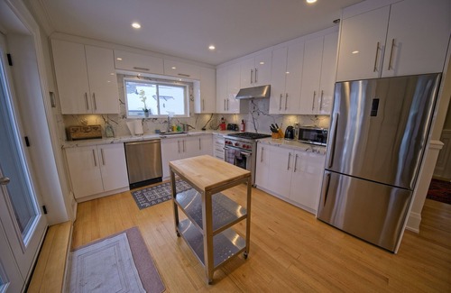 Located on the second floor of a century-old home steps from a 400-acre park and Lake Ontario. Two bedrooms (king size beds), 2 glass showers, modern European kitchen with Wolf gas range, ensuite washer and dryer, AC, Gas fireplace, wifi, two TVs with Netflix, Amazon Video, Crave TV, HBO, Sat. TV, and 400 sq foot deck.