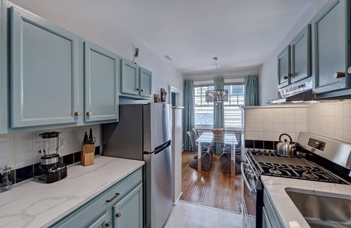 The recently renovated kitchen features quartz counters and stainless appliances and is fully equipped with pots, pans, utensils, etc. The adjacent dining room comfortably seats four and has all the place settings.