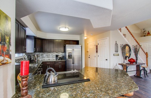 Step into the fully fenced backyard and savor the fresh Colorado air. Dine al fresco on the covered patio with seating for eight, fire up the grill for a barbecue, or soak in the private hot tub under the stars.