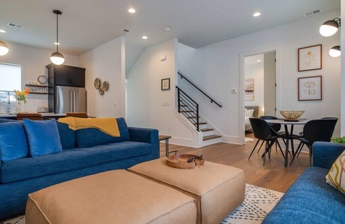 Welcome to our luxurious twin Germantown homes! Experience designer interiors across two homes, perfect for up to 20 guests. Enjoy private rooftop patios with stunning skyline views. Conveniently located in walkable Germantown, just minutes to Broadway and Music Row. Features include Smart TVs, complimentary high-speed internet, and multiple garages. Nearby favorites include Barista Parlor and 5th & Taylor, plus vibrant nightlife options. Experience Nashville like never before at our two homes, positioned side by side in a premier area of Germantown, just 1.5 miles from the vibrant heart of Broadway in the charming Germantown neighborhood. Perfectly designed to accommodate up to 20 guests, our two-home buyout features exquisitely crafted interiors and private rooftop patios with breathtaking skyline views. Enjoy the convenience of multiple parking options in our private garages while exploring the area’s award-winning bars and restaurants within walking distance.