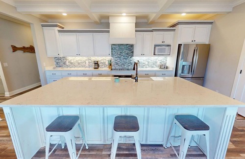 The heart of the home is its private pool, perfect for relaxing dips any time of day. Inside, the fully equipped kitchen makes mealtime a breeze with modern appliances and ample space for group cooking. After a day of beachcombing or exploring the island, unwind in the jetted tub, cozy up in the air-conditioned living room, or stream your favorite shows on the Smart TV with high-speed Wi-Fi.