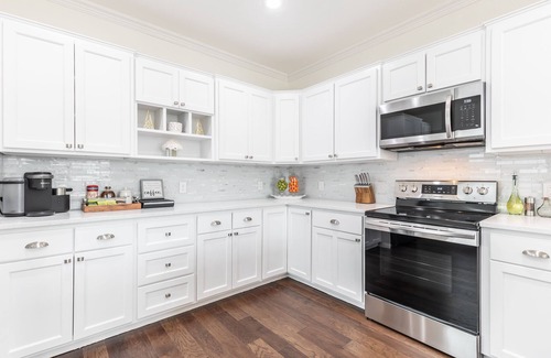 Airy and bright, this home is like a breath of fresh air. The high ceilings and large windows make this home feel even more spacious with 4 roomy bedrooms and access to all the essentials. As you enter, you are greeted by warm natural sunlight and a luxurious living space that features a plush velvet sofa and high-end velvet accent chairs. Unwind after a day of exploring Dallas near the fireplace and 55”HDTV in the open living space! The full kitchen has all new stainless steel appliances, take advantage and cook up a feast! For those who need a pick me up cup of coffee, treat yourself to the coffee station located in the full kitchen! Get seated at the modern dining table that seats 6 and the oversized kitchen island that seats an additional 3!
