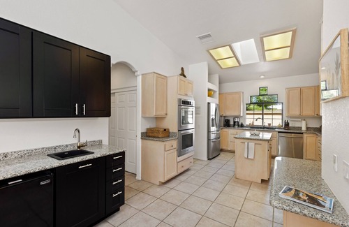 As you step inside, you'll greeted by a spacious and beautiful decorated hall, go ahead in the living room and sunk in the sofa and enjoy your favorite shows or movies on the large smart TV. It also features fantastic pool and mountain views. The open floorplan seamlessly connects the living space to the fully equipped chef kitchen and the wet bar and ends in the dining room with a huge table fitting 8 people easily.