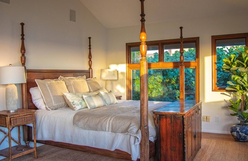 While some bedrooms and seating areas have beautiful floor to ceiling doors that allow for access to tropical views and fresh, island air, another standout offering in this vacation villa is the tranquil koi pond just beyond the front door. Each day can begin and end with a moment of peace, while you peer at the vibrantly colored fish lazily swimming in the soft currents of the pond.