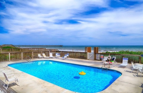 The property has an enormous, oceanfront, community pool reserved for community members only, and sits on a private and secluded section of North Topsail Beach. The home has its own private parking and beach access (no streets to cross of course because you are on an ocean front lot already). Ample parking space will allow you and your guests to park comfortably, easily accommodating 6 or more cars, with a 2 car covered garage. You just couldn't find a better location.