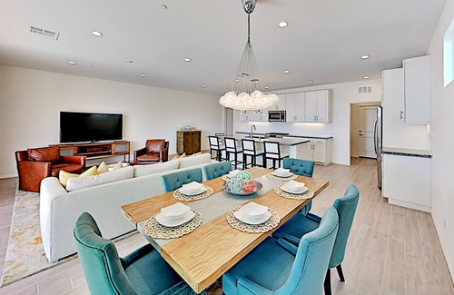 living area to the patio and pool. Recline on gorgeous leather furnishings and a comfy sleeper sofa while a new movie screens on the smart TV.