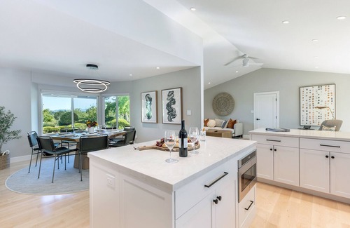 The Green Valley Oasis is a luxury retreat nestled into the rolling, vineyard covered hills in the banana belt region of NW Sebastopol within minutes of dozens of incredible wineries. This modern ranch house just underwent a complete renovation down to the studs, so everything is sparkling new, professionally designed, and features high-end finishes throughout. You'll savor cooking in the large gourmet kitchen with Italian (Bertazzoni) appliances or grilling a feast on the 5-burner Napoleon gas grill while taking in views of the surrounding vineyard. This house offers 3 bedrooms and 3 full bathrooms, with a large master suite spacious bath with a meticulously tiled shower, free-standing tub, and big picture window looking out into the garden. The wall bed in the living room allows it to be utilized as a fourth bedroom. Each bedroom enjoys wonderful views of the wine country, garden, or the Mayacamas mountains and Mount Saint Helena on the horizon. The high-end furnishings are coupled with comfortable high thread count sheets and bedding to complete the sophisticated feel of this 5-star vacation property. The family room, sunken living room, and master suite each have glass sliding doors opening up on to a large patio or private deck areas, creating a truly seamless indoor/outdoor experience.