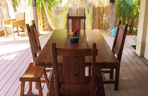 Enjoy island breezes from the backyard Tiki Hut and outdoor seating area overlooking the canal. Gorgeous Farm Style dining table allows you to enjoy dinners alfresco under the stars. Breezy Palm Trees and swaying Hammock chairs cradle you to sleep. Restore the spirit with private yoga sessions upon request.