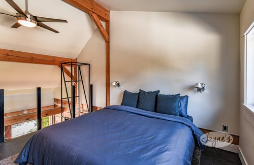 This stunning space is surrounded by 4 walls of glass that bring outdoors in! An oversized sectional is centred in the room across from a large flatscreen TV. Behind, a 10ft sliding glass door walks out to the expansive back deck. A sleek, modern wood-burning fireplace soars up to the cathedral ceiling alongside a hammock.