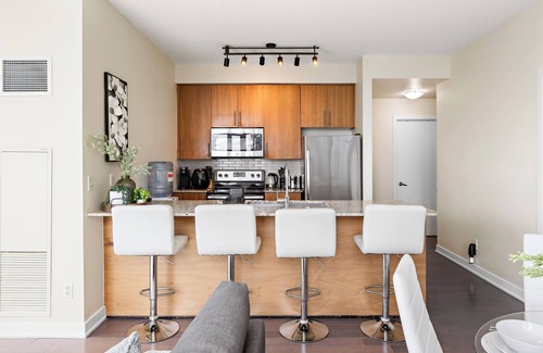 Experience luxury in the heart of Mississauga! Enjoy our stylish, 2BR+den condo with breathtaking city views. Steps from shopping, dining, transit. Features ENDY mattresses, Smart TVs, high-speed internet, fully-equipped kitchen, private balcony, and secure parking. Sleeps 7 comfortably. Perfect for groups, families, or business travelers. Your comfort, convenience, and style await!