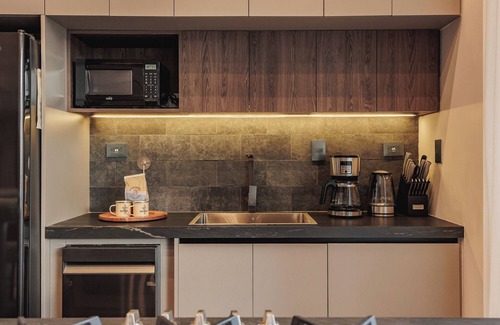 The kitchen is the perfect combination of aesthetics and functionality, it has an island that also serves as a seating bar, it has appliances such as dishwasher, oven, microwave, and stove; it is fully equipped for a very pleasant stay.