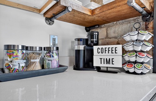 This “loft style” designed suite located at The Penthouses on Main in downtown Blue Ridge offers 2 Bedrooms & 2 Bathrooms, both ensuites, plus a queen size sleeper sofa in the living room for a maximum occupancy of six people. Catch the “mountain vibe” as you first enter the entrance door as the foyer offers a rustic reclaimed barnwood accent wall with coat rack, bag drop & shoe rack storage area that directly opens into the common living room & kitchen featuring lots of windows & natural light overlooking the downtown area & The Blue Ridge Scenic Railway depot. This suite is Suite 104 at The Penthouses on Main building in historic downtown which offers a total of 6 luxury suites. All suites have been completely updated & modernized with luxury finishes from a recent professional renovation by Nathan Fitts, the building owner & your host, known for some of the most notable luxury home designs in the area. The primary bedroom features a king-size bed & secondary bedroom features a queen-size bed + living room queen size sleeper sofa. The secondary bedroom has modern style all frosted glass rolling barn doors that open the entire bedroom up into the common spaces or you can keep closed for privacy. The primary bathroom features a walk-in subway tile shower with glass shower door & the secondary bathroom features a tub/shower combination featuring modern style barnwood tile shower walls & all glass front & shower door. The living room & kitchen areas have lots of surrounding windows allowing for lots of natural light & with views overlooking the mountains & the downtown area including The Blue Ridge Scenic Railway Depot. Character & charm is displayed throughout including the restored exposed original brick walls which have been brought back to life giving life to these rooms. The kitchen offers a combination of modern farmhouse open shelves and cabinets for storage and is equipped fully with refrigerator & freezer, dishwasher, microwave, range and has all cooking supplies, small appliances, utensils in addition to accessories such as Keurig coffee maker with a variety of sweeteners & creamers, toaster oven, blender, mixer, baking tools, glassware & dishes, portable dining tray tables + more. Also, fully equipped & stocked with wet bar supplies including wine glasses, martini glasses, champagne glasses, Moscow mule mugs, beer mugs, wine opener, wine aerator, cocktail shaker set & more. The living room offers a comfortable & cozy leather sofa with linen accent chair highlighted by the corner slate electric fireplace and 55" smart TV offering the perfect place to relax & unwind. Entire suite features hand scraped pecan hardwood floors with tile bathroom floors. More architectural highlighted featurs you'll notice throughout include exposed beams, wide wood baseboard trim, reclaimed 100+ year old barnwood accent walls from family barn + various other added decorative design elements.