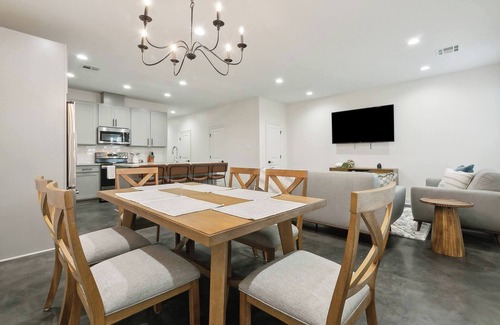 Modern Haven is a stylish 3-bedroom, 2.5-bath furnished townhome designed for comfort and convenience. The open-concept main floor features a fully stocked kitchen with granite countertops, a gas stove, and a large island with bar seating. Upstairs, all bedrooms include spacious closets, with a custom walk-in closet in the primary suite. Guests enjoy a private fenced yard, washer and dryer, one-car garage, smart TVs, fast WiFi, and modern furnishings throughout—perfect for extended stays.