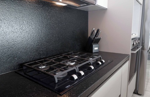 Fully equipped kitchen with luxury Teka kitchen equipment, dishwasher, oven with airfryer, ice machine, Nespresso coffee maker and Nutribullet blender