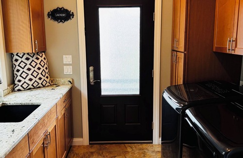 The guest house, located just steps from the main home, offers a private retreat with its own full kitchen, large living room, king bedroom, and a second bedroom with two queen beds. A full bathroom is located between the bedrooms, with an additional half bath and second laundry area downstairs at the entry level. This space is perfect for extended family or friends who prefer more privacy while remaining close to the main gathering areas.