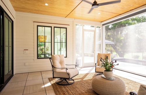 Step outside to a remarkable covered porch with a retractable screen leading to the pool deck. Savor the island's breeze and enjoy the expansive view of the pool and golf course. Or enjoy al fresco dining with seating for six.